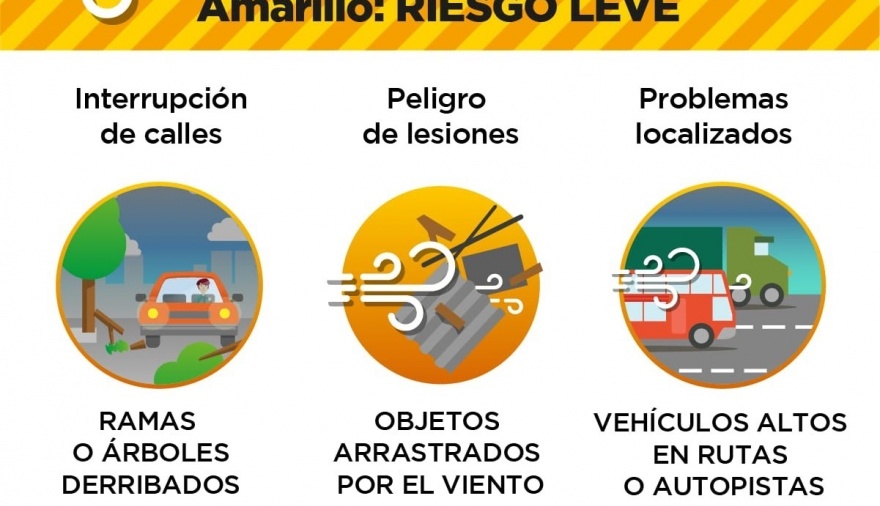A tal efecto, y ante el NAR ‘Amarillo’ por posibles vientos, se recomienda a los vecinos circular con precaución durante el mencionado período, a poca velocidad y con las luces bajas encendidas; no tocar cables ni postes de luz; y asegurar objetos que puedan volarse en balcones y ventanas.