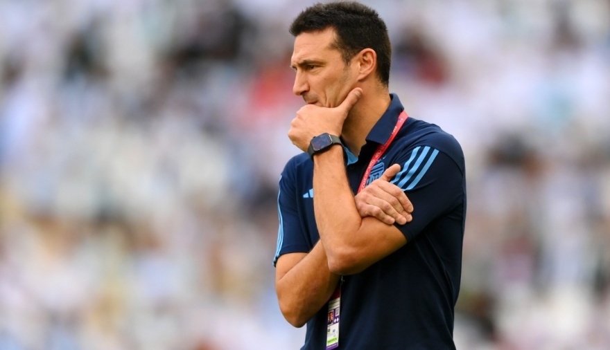 El entrenador Lionel Scaloni estuvo solo a un costado y con un pelota en los pies recorrió distancias cortas con gesto serio y pensativo.