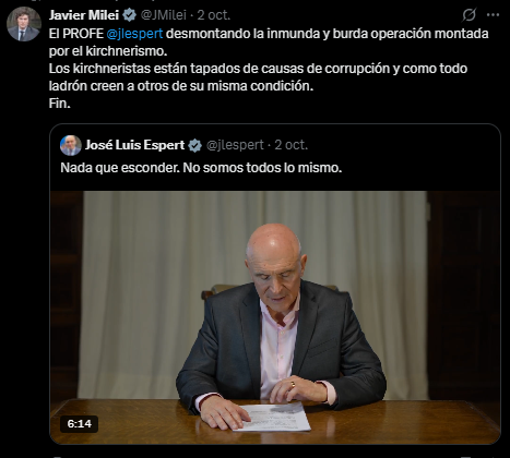 "El profe José Luis Espert desmontando la inmunda y burda operación montada por el kirchnerismo. Los kirchneristas están tapados de causas de corrupción y, como todo ladrón, creen a otros de su misma condición. Fin", indicó el jefe de Estado.