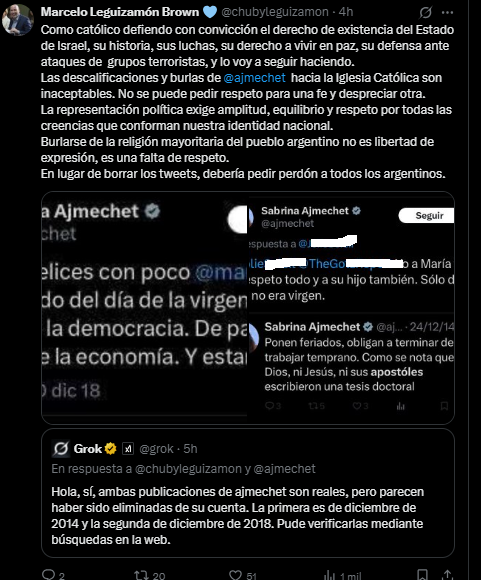 En ese contexto, Leguizamón se indignó y compartió en sus redes esos mensajes con una reflexión: “como católico defiendo con convicción el derecho de existencia del Estado de Israel, su historia, sus luchas, su derecho a vivir en paz, su defensa ante ataques de grupos terroristas, y lo voy a seguir haciendo. Las descalificaciones y burlas de @ajmechet hacia la Iglesia Católica son inaceptables. No se puede pedir respeto para una fe y despreciar otra. La representación política exige amplitud, equilibrio y respeto por todas las creencias que conforman nuestra identidad nacional. Burlarse de la religión mayoritaria del pueblo argentino no es libertad de expresión, es una falta de respeto. En lugar de borrar los tweets, debería pedir perdón a todos los argentinos”. Incluso el legislador publica una consulta que le hace a la IA.