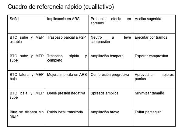 Antes de ejecutar, buscá dos confirmaciones: (a) compresión de spread en P2P y (b) dirección coherente entre MEP y BTC/USD. Si falta una, reducí tamaño o esperá.
